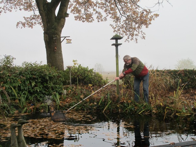 Veel blad is nu van de bomen maar de eikenboom bij de vijver begint nu pas zijn blad te verliezen en dat valt in de vijver en dat willen we niet. Wim heeft nu een net met een héle lange stok eraan. Daarmee is hij al weken bezig de vijver schoon te houden, maar nu is er geen houden meer aan. De hele morgen dwarrelen de eikenbladeren naar beneden. Wim kwam net binnen met z’n netje aan een héle lange stok. Het netje was aan één kant wat losgegaan van de stalen ring. ‘Kö-j mien dat netje nog een betje an-ikkeren?’ Hij keek met een bezorgde blik naar de dwarrelende bladeren.