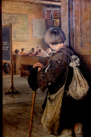 Een foto van Co van dit prachtige schilderij uit de 19e eeuw. Een Russisch jongetje staat op de drempel van een schoolklas, twijfelend of hunkerend of hij naar binnen zal willen gaan.