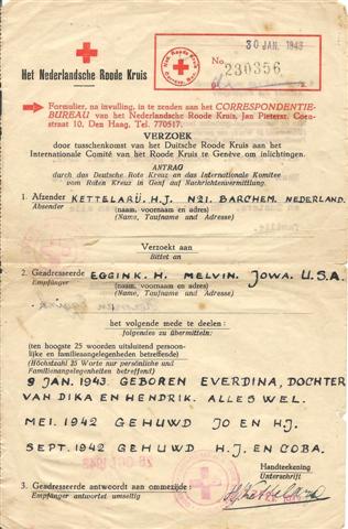 In de 2e WO 1940-45 was er geen enkel direct contact tussen de familie hier in Nederland en in de USA. Toen in januari 1943 Eefje geboren werd bij tante Dika en oom Hendrik Kettelarij probeerde ome Hendrik een berichtje naar Amerika te sturen via het Internationale Rode Kruis in Genève.