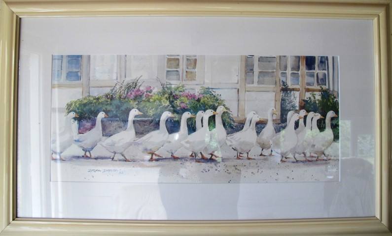 Al meer dan 25 jaar hangt deze aquarel print van een Engelse schilderes op een mooie plek in ons huis. Een paar weken voor onze 25 jarige trouwdag, we woonden nog aan de Kuifmees, gingen Wim en ik even rondkijken in een leuke meubelzaak en behalve meubels hadden ze ook aardige dingen voor aan de muur. Ik had toen nog geen enkel vermoeden dat ik me zelf nog eens zou toeleggen op schilderen, maar deze aquarel vond ik erg mooi. De voorstelling boeide me zo dat ik onszelf al voorop zag lopen met de kinderen, de een wat volgzamer dan de ander, familie en vrienden in ons kielzog. Voor mezelf had ik verschillende ganzen al een naam gegeven. Nee, kopen deden we dit toen niet, je hoeft toch meteen niet alles te kopen wat je ziet. Ik dacht er al niet meer aan, maar op de grote dag kwamen de kinderen ineens met deze voor de dag. Wim had het ze ingefluisterd. En dat het een rake ingeving was bewijst wel het feit dat al die tijd aan het Schoolpad het een prachtig plekje had gekregen in de eetkamer. Nu vind ik dat het een rustgevend idee om het in de slaapkamer te kunnen bewonderen voor ik het bed in stap. Zeg nou zelf… met deze ganzen er boven en Storm naast mijn bed op zijn schapenvachtje, dat heeft toch wat….?