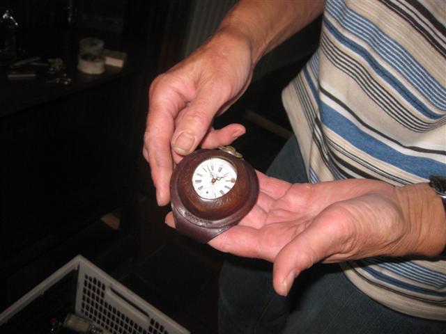 Een eerste polshorloge, de opvolger van het vestzakhorloge. Eigenlijk is het een leren band waar zo’n vestzakhorloge precies in past.