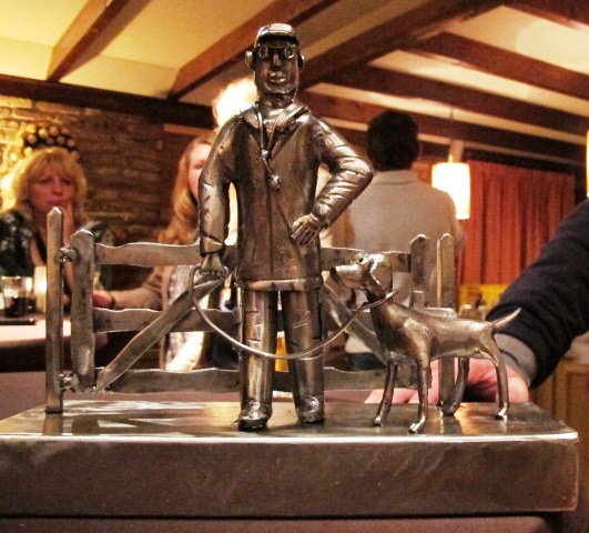 ‘Krieg ie zo dat melkkänneken d’r bie-j op?’ Henk had me een kunstwerkje gewezen dat een voormalig collega en tevens hondenvriend Henk Harkink voor hem had gemaakt. Dat probeerde ik te fotograferen. Ja.. en zo’n attribuut er achter bederft de boel. De fotograaf spreekt! Het was een heel spektakel. Toen we aankwamen in Laren dacht ik minstens dat er een bruiloft aan de gang was, zo vol was die zaal, maar nee… het was het afscheidsfeestje van Henk. De zaal zat vol met collega’s, oud-collega’s, vrienden en familie. Zelfs de Duitse vrienden uit het Sauerland waar Henk een paar jaar voor de Nijha gewerkt heeft, waren er, Jürgen en Jutta. Henk woonde toen in een deel van hun huis.