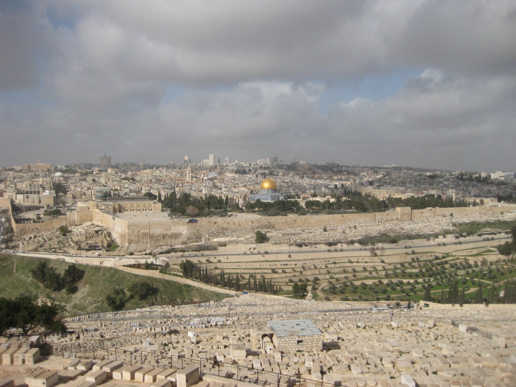 De mooiste plek: De Olijfberg met het zicht op Jeruzalem. Je ziet de muren van de Oude Stad, ooit onder koning Herodes gebouwd. De Heilige Grafkerk, de Al Aksa Moskee en het paleis van Pontius Pilatus, allemaal van hieraf te zien.