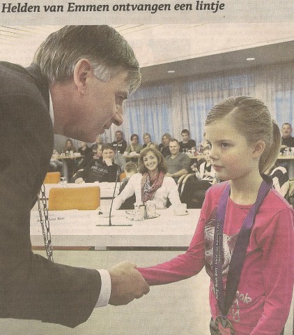 – Amy Bos (op de foto met burgemeester Bijl) uit Klazienaveen sloeg direkt alarm toen haar broertje dreigde te verdrinken.