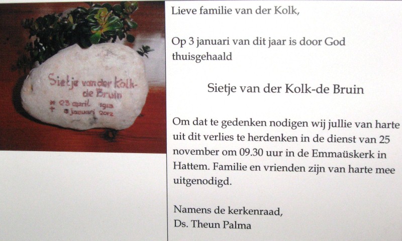 ‘Doe toch kalm an’, roep ik van achter uit de auto. We worden bijna van de weg geblazen en het is net of het achterste stuk van de auto nog een extra zwiep geeft. Wim mindert gehoorzaam vaart van 135 naar 115 km per uur. Rick geeft geen krimp, grijnst wat naar mij en zit gezellig naast hem. We zijn alweer op pad, nu naar Hattem om de herdenkingsdienst in de Emmaüskerk bij te wonen, waar de 6 mensen herdacht worden die afgelopen jaar overleden zijn. Oma van der Kolk was de eerste op 3 januari. De 6 herdenkingssteentjes waren het jaar door in de kerk bewaard en werden nu meegegeven aan de familie. Catharina mocht de kaars voor oma aansteken en was met het hele gezin ook aanwezig. Het werd een sfeervolle herdenking met medewerking van Jubilate Deo waarin Ben de baspartij meezingt.