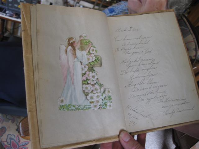 The poeziealbum of Dina in which sisters , brothers and friends wrote their poem. This poem is from her girlfriend Sientje, but also little brothers Jan and Bram and even Herman when he was back in Holland in 1929 wrote their poem in this lovely poeziealbum.