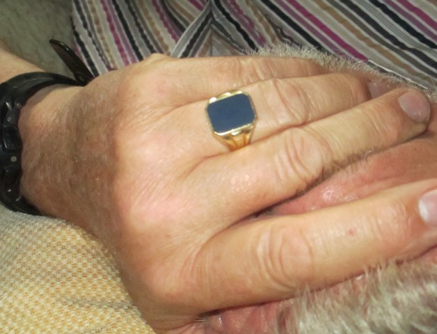 In een mooi paars zakje zitten de kleinoden van Wim, teruggekregen van de Uitvaartleidster. Een ervan is de gouden ring met de blauwe steen. Hij was er heel blij mee. Hij hield wel van enige versiering, maar de laatste jaren droeg hij het samen met zijn trouwring aan zijn halskettinkje met het Hugenotenkruisje dat hij als eerste van me kreeg. Zijn vingers waren dunner geworden en hij wilde ze niet weer verliezen. Het herinnert me aan die keer dat hij de ring met blauwe steen kwijt was… zomaar kwijt…