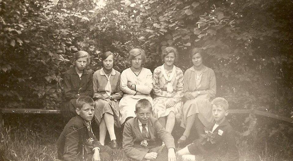 Een stel vriendinnen, maar erg vrolijk kijken ze niet allemaal. Zeker Jo niet die links achteraan zit. Ook Dina niet, die kijkt wat stoer. Pubers van toen. Naast Dina zit Anneke van Ark en daarnaast Dika.