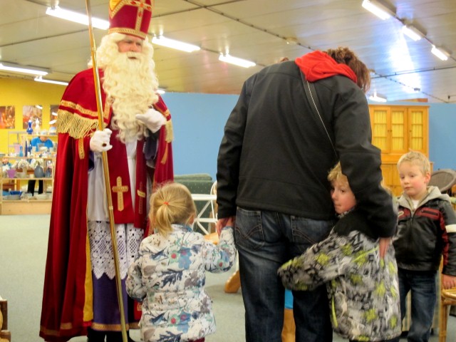 ‘Zo… zijn jullie aan het recyclen?’ Ik had amper mijn ontboezeming over de te missen sinterklaasavond met de familie, zoals in vroeger dagen, aan dit blog toevertrouwd of de goedheiligman kwam in eigenste persoon naar Kringloop Het Goed met zijn Pieten. Een paar weken geleden was hij hier al stiekem komen kijken of ze misschien een mooie rode stoel voor hem hadden. En dat hadden ze. Maar als tegenprestatie vroegen ze een bezoekje van de Sint aan de winkel met zijn Pieten, maar nu in werkkledij. En dat gebeurde vanmorgen net toen we met een groepje aan de Winterworkshop meededen. Van lege soepblikken en heel veel lintjes, balletjes en spiegeltjes maakten we een leuke verzameling windlichten voor op de tuintafel. We hadden ons al op tijd opgegeven want een eerdere workshop vliegengordijn maken met stroken stof was een succes gebleken. Dit heeft ook wel wat om midden in de winkel aan een grote tafel te zitten knutselen met z’n zevenen. En dat voor 5 euro terwijl we er nog een kopje koffie bij kregen. De Pieten waren nogal muzikaal en dat was te horen en ze waren nogal zwak in ’t köntje, zoals pa dat vroeger noemde. Ze dansten en sprongen in ’t rond. De kinderen in de winkel waren niet allemaal even enthousiast, te zien aan de ernstige gezichtjes en het kind dat achter de moeder wegkroop. Heel even dacht ik aan de fladderende broekspijpjes van broertje Henk toen hij op verzoek van de sint aan de voordeur een liedje moest zingen….. hééél lang geleden, dat wel!