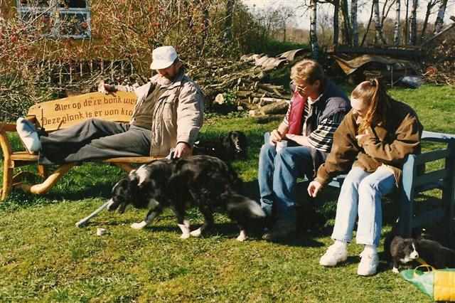 Op deze foto is te zien dat Wim z’n laatste volleybalwedstrijd heeft gespeeld. Hij kwam ongelukkig terecht met als gevolg uitgerekte enkelbanden en zes weken gips. Z’n voet stond er dwars onder en is met veel moeite weer op z’n plek gebracht. Het is voorjaar 1997, de tijd van ons eerste nestje pups van Kim en Scott. Rechtsonder is er nog één te zien, ik denk Senna, vlakbij de tas waarin we ze meenamen naar de wei. Ze liepen nog niet erg. Kim ligt achter de bank een ander stel pups te zogen en Scott loopt op de voorgrond. Hilda was regelmatig bij ons aan het Schoolpad en Rick woonde toen zelfs nog bij ons in de studio in de schuur.