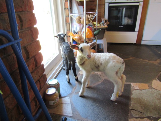 Daar zijn ze dan, een witte Schoonebeker en een klein donker Drents heidelammetje. Ik haalde ze al door elkaar. Hoe kon ik me vergissen. De Schoonebekers hebben een mooie lange nek, beetje trots. En zo’n Drentje, altijd leuk. Deze begon meteen al uit de fles te drinken, maar de Schoonebeker wilde er eerst niet veel van weten. Ik gebruik de volgende tactiek in het begin. Oude handdoek over mijn schoot, lam op schoot met de achterbeentjes tussen mijn knieën. Met de hand wrik ik het bekje voorzichtig open, speen er in en dan hopen dat ze het meteen doorhebben dat dit net zo lekker is als bij moeder ooi. Het nest naast de open haard, opnieuw in elkaar gezet met stukken lattenbodem van het huwelijksbed van Willem en Hilly, fungeert nog steeds prima. Oude deken er in, plastic er op, daarna een laag kranten en dan een oude handdoek er op. Ja, de was stapelt zich zo wel op maar het bevalt mij goed zo. De twins zijn al even mee naar buiten geweest maar ze weten nog niet dat ik hun kunstmoeder ben en vluchten ze weg als ik ze weer wil pakken. Daarom een kort uitje.